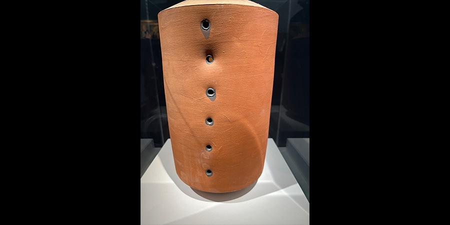 She has said that she is interested in objects in the landscape and has included some wonderful paintings of 1814 by Thomas Robert Guest of Bronze Age and Saxon Grave Goods, excavated from a Bell Barrow in Wiltshire.. Her own passion for the painter Paul Nash is underlined by the inclusion of his Event on the Downs of 1934, with its gnarled tree stump and mysterious tennis ball, which has been set between her diptych Ideas for a Sculpture in a Setting, inspired by one of the many flints collected by Henry Moore and kept in his studio. Shot is black and white the object becomes part vertebrae, part talisman, echoing the rock formations and stone henges to be found in this part of the countryside.